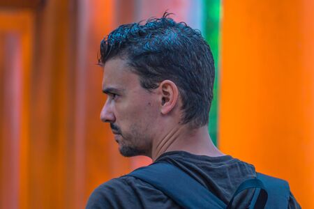 Portrait of a man in a gray sweatshirt on a dark background