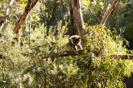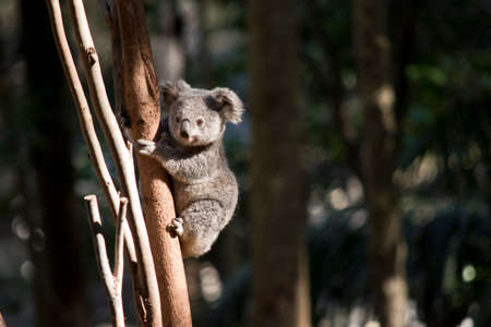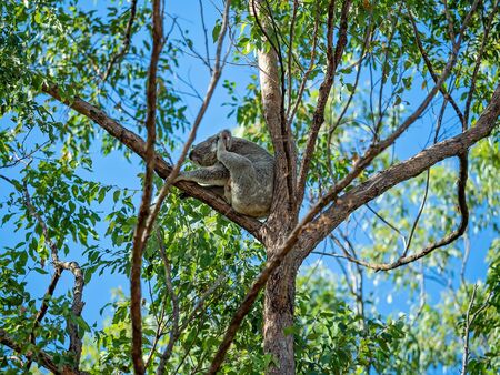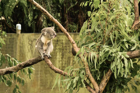 A koala scientific name Phascolarctos cinereus sitting in a tree on a sunny day in an Australian wildlife sanctuary