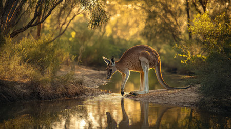 A majestic kangaroo stands by the water's edge, creating a stunning reflection against the backdrop of a vibrant Australian landscape at golden hour.