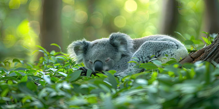 A serene image of a koala sleeping comfortably nestled among lush eucalyptus leaves. This adorable creature represents the beauty of wildlife in its natural environment.