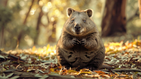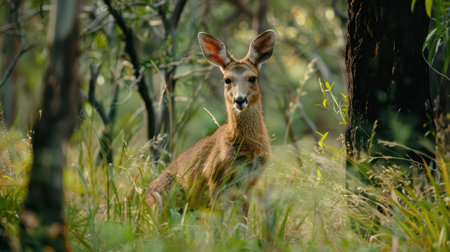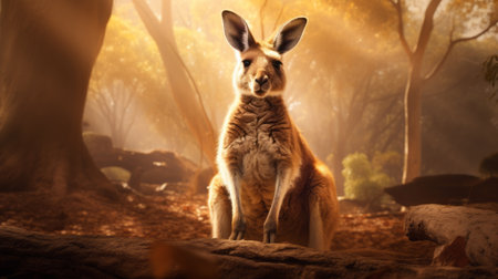 a kangaroo sitting in a forest, basking in the warm sunlight. this photorealistic rendering captures the essence of nature in a high-quality photo. the macro photography highlights the intricate details of the kangaroo's character design. the light amber and red hues add depth and beauty to this national geographic-worthy image. ai generated