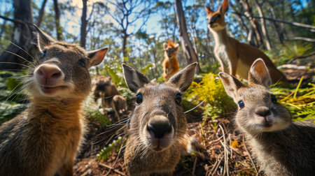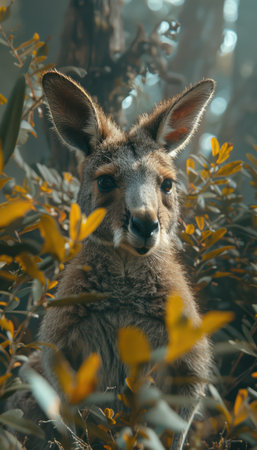 A captivating close-up of a curious kangaroo in its natural Australian habitat Bathed in warm sunlight, the marsupial stands amidst lush foliage, its inquisitive gaze fixed on the camera This stunning image offers a glimpse into the vibrant wildlife of the Australian wilderness AI Generative