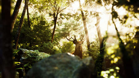 A serene deer stands cautiously in a lush green forest, surrounded by vibrant plants and dappled sunlight filtering through trees.