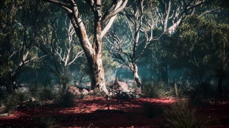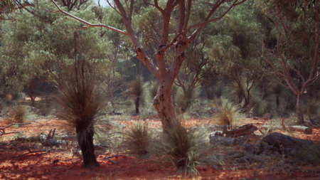 Bright red soil contrasts with green shrubs and trees in this serene Australian scene. The sun filters through the branches, illuminating the natural beauty of the environment.