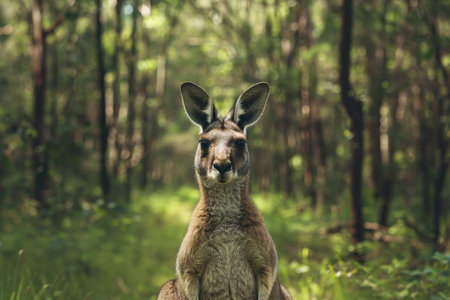 A curious kangaroo stands poised in a sunlit forest clearing, capturing the essence of Australian wildlife. The serene environment showcases natural beauty.