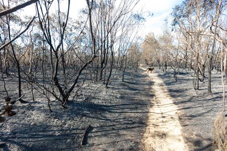 Scorched earth and blackened tree trunks caused by a large bush fire in the southern Sydney suburb of Barden Ridge.