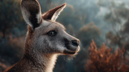 A stunning close-up of a kangaroo captures its expressive features against a soft morning backdrop. This image embodies the essence of Australian wildlife in a serene setting.