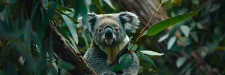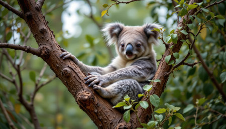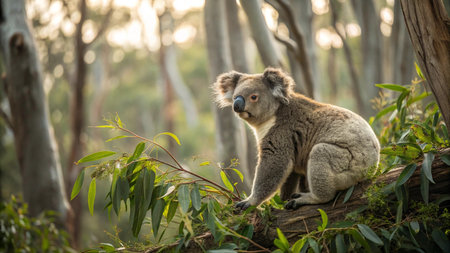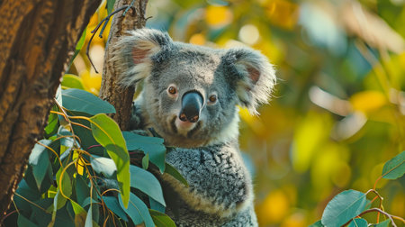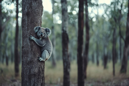 Koala bear clinging to a eucalyptus tree trunk, nestled in its natural habitat within an Australian forest teeming with wildlife