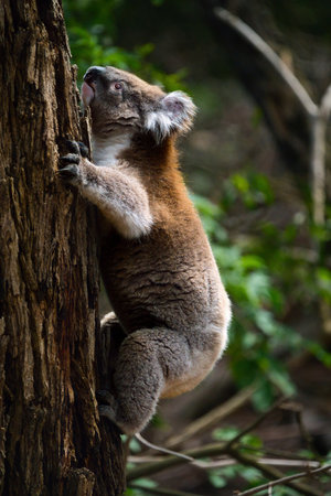 Adorable koala (Phascolarctos cinereus) climbing a tree, showcasing its natural habitat in the Australian wilderness.