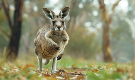 A beautiful kangaroo leaps gracefully through a sunlit Australian forest, surrounded by vibrant greenery and soft morning light, showcasing the beauty of wildlife.