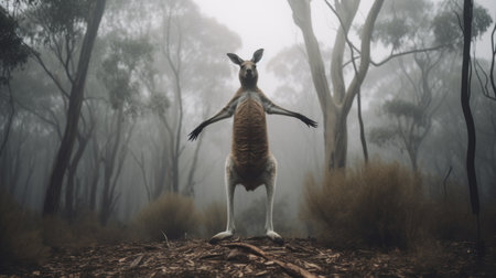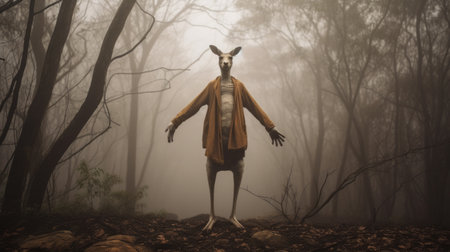 a floating, vibrant kangaroo stands tall amidst a foggy, winter forest in a striking display of contrast. the scene captures a surreal moment, where the colorful kangaroo levitates gracefully in an otherwise dull and monotone environment. this unique image, shot with a hasselblad camera, exudes a delicate and ethereal quality suitable for a magazine editorial shoot. ai generated