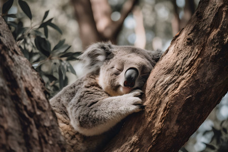 Peaceful Slumber An Australian Koala Finds Rest on a Eucalyptus Branch in a Tranquil Forest