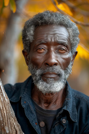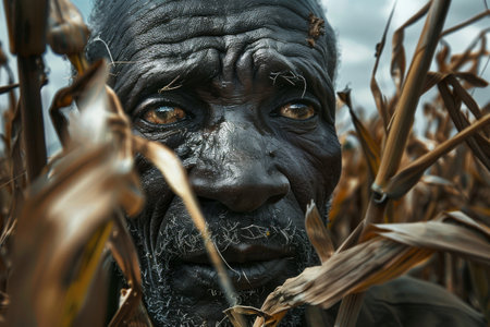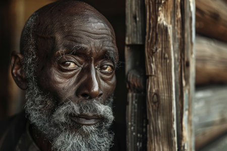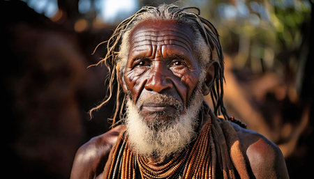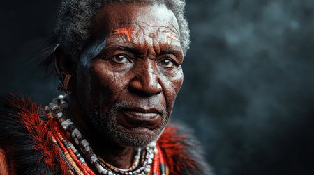 AI generated image showing the portrait of an old black indigenous man in blurry back