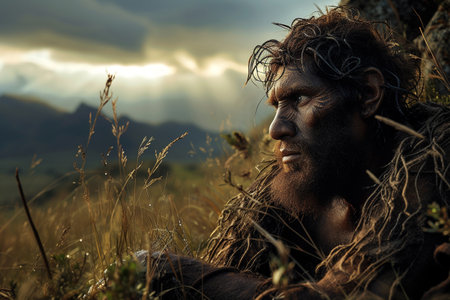 Portrait of prehistoric man in cave. Face of Neanderthal caveman with beard. Ancestor of mankind. Created with Generative AI