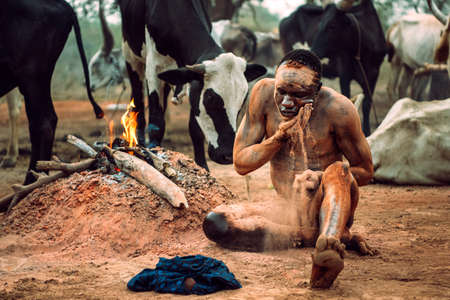 MUNDARI TRIBE, SOUTH SUDAN - MARCH 11, 2020: Man sitting on ground near bonfire and traditionally smearing body with orange ashes for hygiene while grazing livestock with fellow tribesmen in savanna in South Sudan