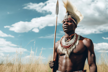 An indigenous African warrior stands proudly in a field, dressed in traditional attire and holding a spear, symbolizing strength.