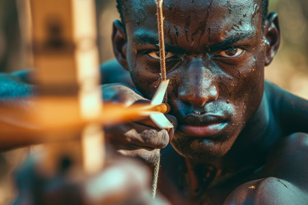 A man is holding a bow and arrow, with sweat on his face.