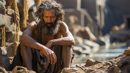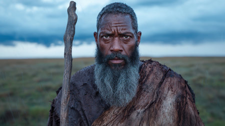 Rugged bearded man with wooden staff in desolate landscape