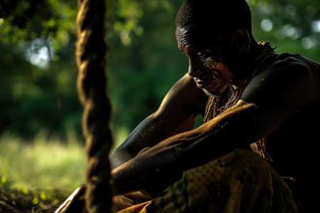An African shaman using ancestral artifacts in a spiritual healing ceremony, reflecting deep-rooted tribal traditions.