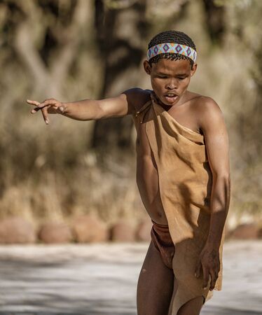 Erindi, Namibia - July 19, 2018: A native bushman gives a farewell dance to wish good hunting to the photographers in Botswana