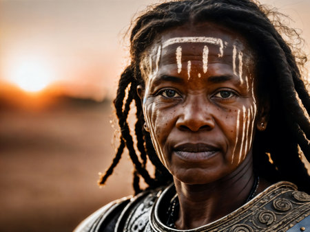 photo of strong ancient senior black female warrior with roman armor stained, generative AI