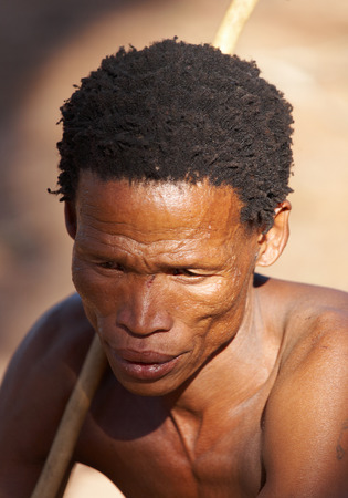 Namibia-MAY 06, 2007: Portrait of bushman hunter May 6, 2007 in Namibia, Kalahari Desert. Bushmen are an indigenous people of southern Africa living in Namibia, Botswana and some another countries