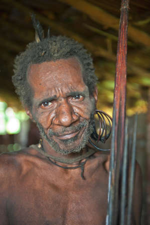 WILD JUNGLE OF NEW GUINEA ISLAND, INDONESIA - JUNE 24: Portrait of Old man with bow and arrows from Korowai (Kolufo) tribe . June 24, 2012 near Onni Village, New Guinea, Indonesia