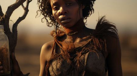Portrait of an African warrior in savannah. Strong humans and symbiose with nature concept. Copy space.