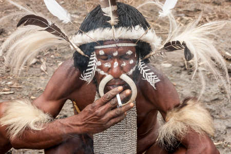 Wamena, Indonesia - January 9, 2010: The head of the Dani tribe in a traditional dress smoking a cigarette in Dugum Dani Village. Baliem Valley Papua, Irian Jaya, Indonesian New Guinea