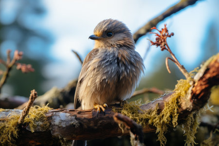 A charming fluffy bird perches on a snowy branch, showcasing its vibrant plumage. This serene winter scene captures the beauty of wildlife in a stunning, tranquil environment.