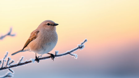 A small bird perched on a frosty branch against a pastel-colored sky during sunrise.