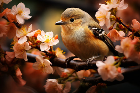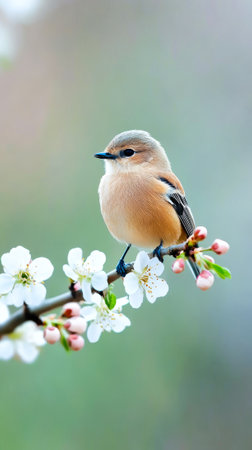 Delicate Bird Perched on a Flowering Branch, Spring Nature Scene with a Serene Ambiance
