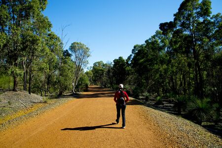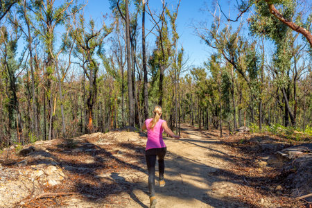 Woman running along a dirt trail in forest wilderness area Blue Mountains