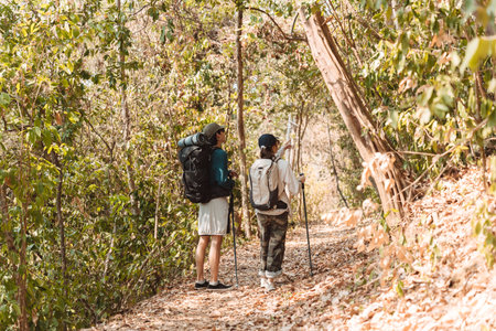 Two female friends with backpacks on vacation hiking through countryside together. Asian friend girls backpacker friend travel in forest wild together. happy and enjoying sunny day while hiking.