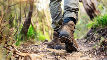A person is walking on a trail in the woods wearing brown boots. The boots are covered in mud and the person's feet are visible. Concept of adventure and exploration
