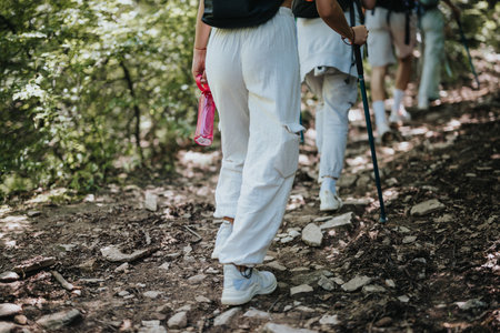 Group of hikers walking on a forest trail with trekking poles and water bottles