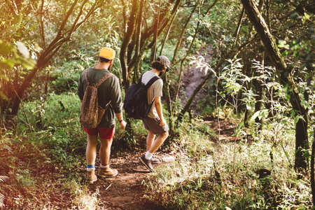 Couple hiking in the rainforest. Lifestyle adventure concept.