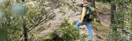full length view of traveler with backpack standing on trail in forest, banner