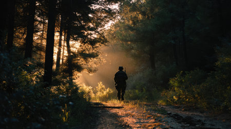 Movie-style shot of a lone armed soldier heading into the quiet forest at sundown, warm cinematic lighting and deep shadows.