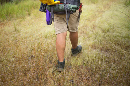 Hiker walks through a small meadow in a tropical forest, Strong legs.