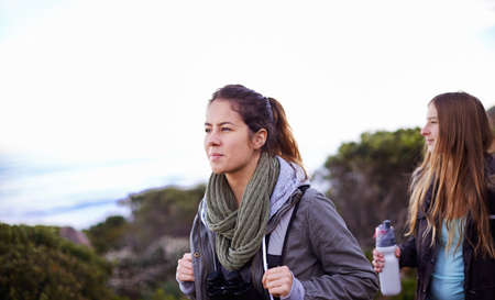 Hiking with a good friend. Shot of two attractive young female hikers outdoors.