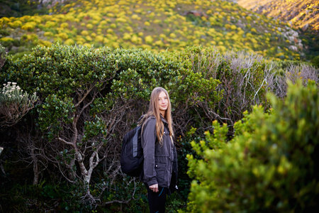 Portrait of a beautiful young woman with backpack hiking in the countryside