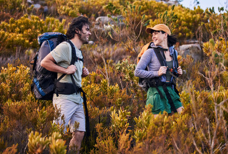 Hiking, travel and couple walking on mountain for adventure, holiday and journey in nature. Travel, dating and happy man and woman talking and explore, trekking and backpacking outdoors for wellness