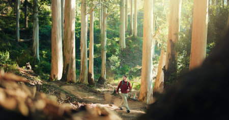 Man, hiking and walk in woods for adventure, sightseeing and nature for tourism on summer vacation. Person, outdoor and trekking in forest, explore or travel in countryside at park