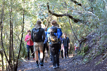 AUCKLAND - JULY 12 2018:Tourist trekking in Rangitoto volcanic island an iconic landmark of Auckland, New Zealand.
