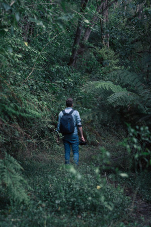 Man walking among the rainforest while holding his camera in his hand. Vertical photos. unrecognizable person
