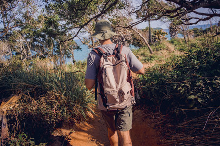 Handsome man with a backpack hiking in the Australian bush.