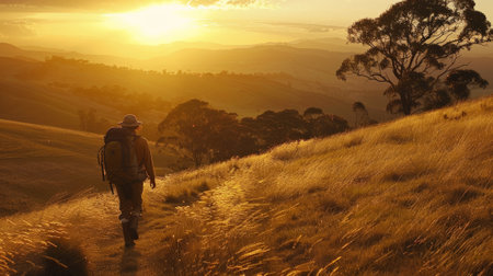 shadows of backpacker while walking down hill at sunset generative ai
