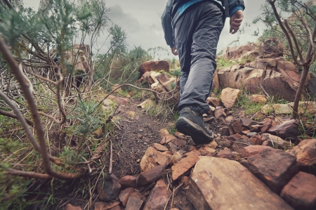 Man hiking bay the trail in the forest.Nature leisure hike travel outdoor