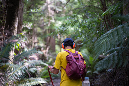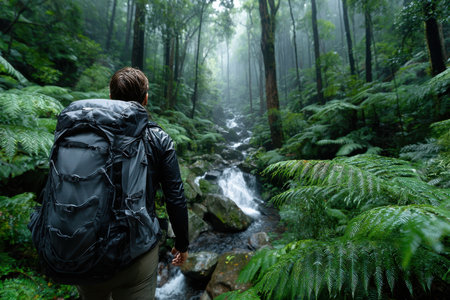 exploring in a rainforest on a trail with a backpack and hiking boots